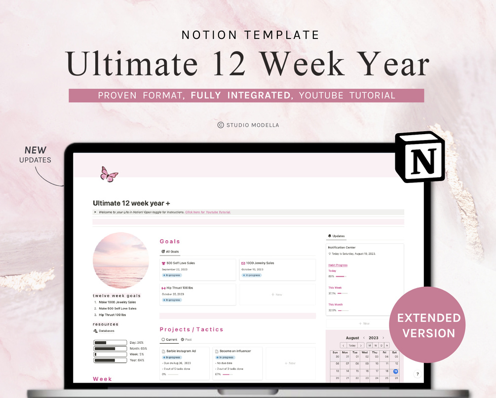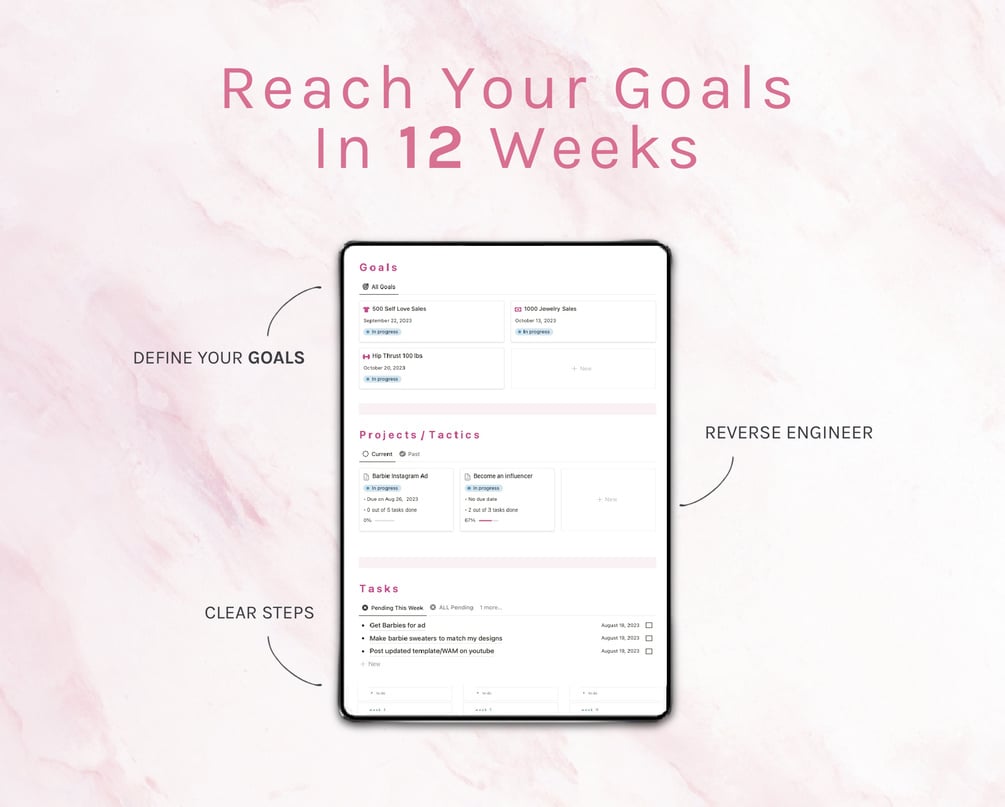 This fully integrated and automatic template will help you accomplish your 12 week year! From goals, into projects, into daily tasks.. this template organizes everything automatically and chronologically keeping you on track and accelerating. With a live notification center showing you your progress and a beautiful aesthetic, you wont need another planner ever for accomplishing your goals.
